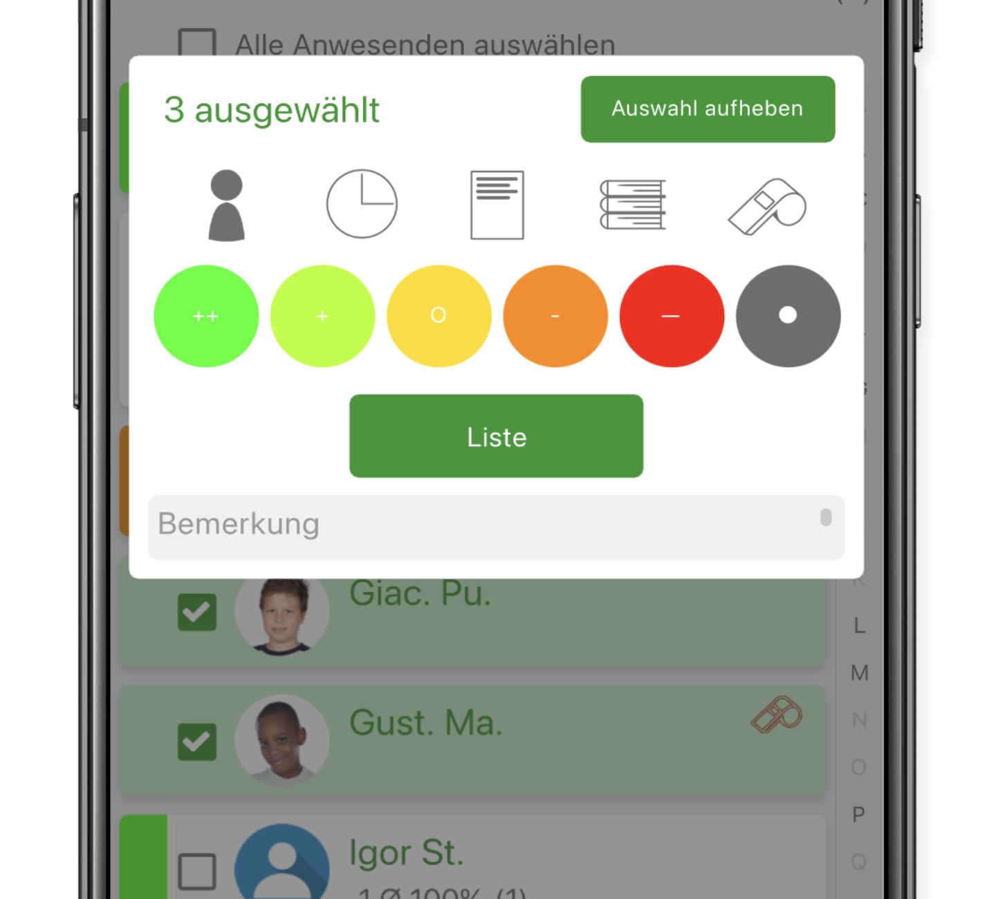 Alle Eingaben starten beim Schüler und werden für den aktuellen Unterrichtstag in der Schülerliste und im Sitzplan angezeigt.