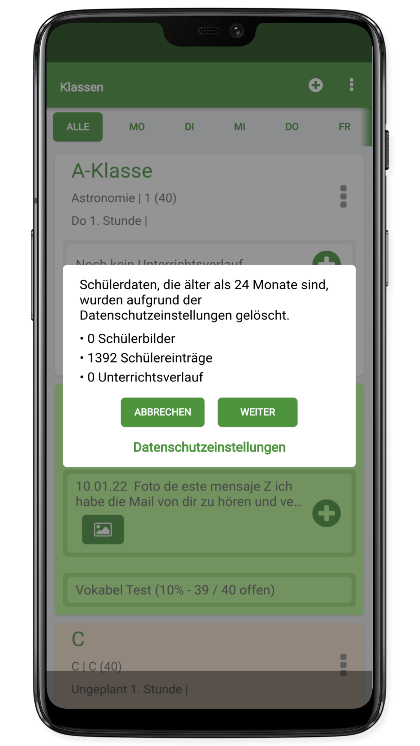 Beim Neustart der App wird geprüft ob Daten veraltet sind und gelöscht werden sollten. Wenn ja, erscheint dieses Fenster. Man kann das Löschen der Daten auch bei Bedarf durch das Drücken auf "Abbrechen" verhindern.