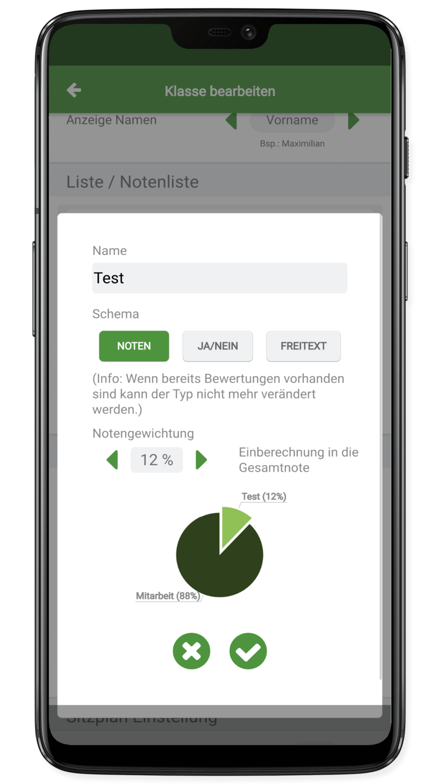 Bei den Einstellungen zur Klasse kann man die Listen anlegen und bearbeiten. Bei dem Typ "Noten" kann man den Prozentsatz angeben, mit dem die Note in die Berechnung den Notenvorschlags eingehen soll. Dieser Prozentsatz kann später jederzeit verändert werden und führt dann zu einer Neubrechnung auch der schon bestehenden Noten.