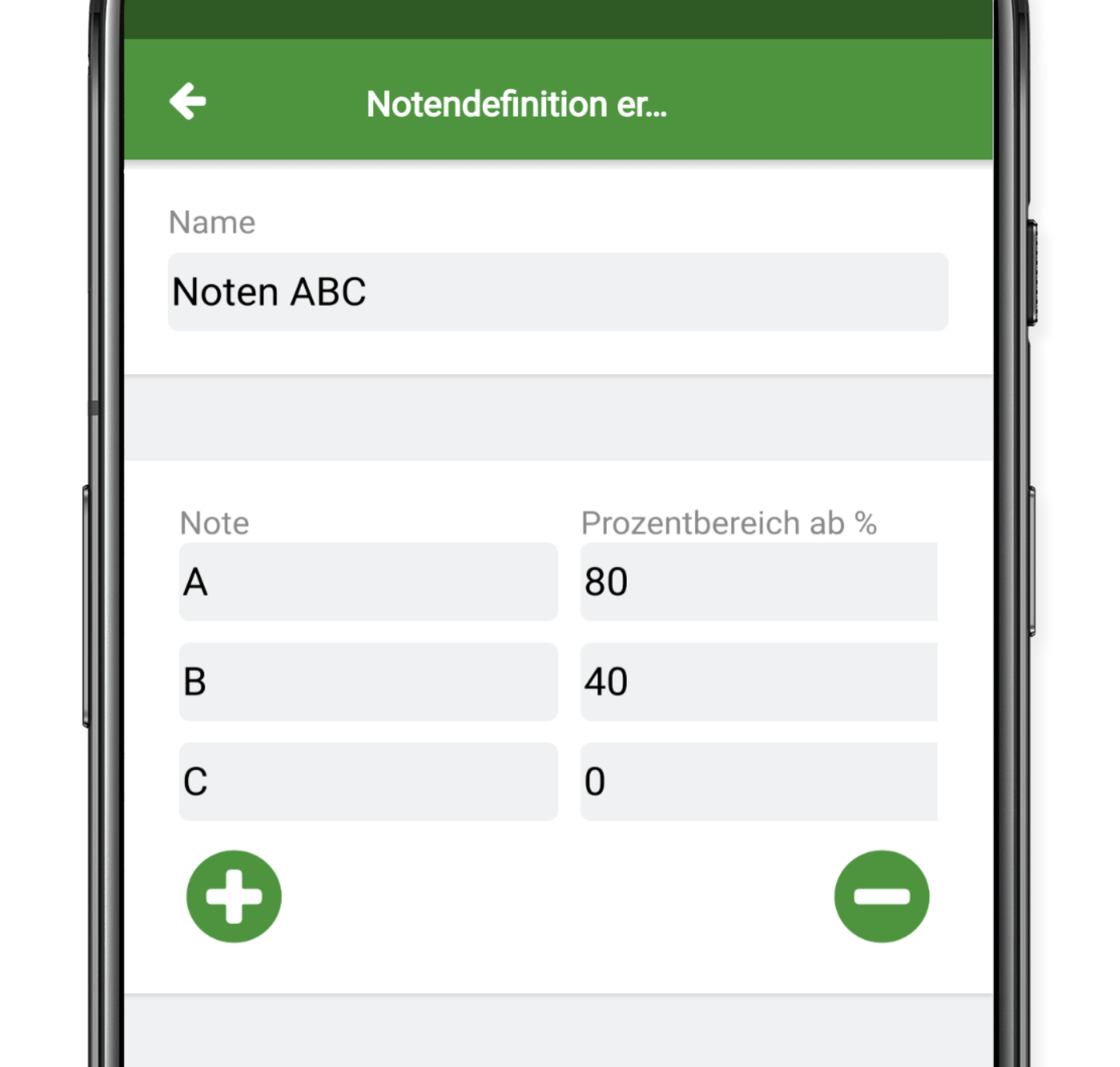 Über ein eigenes Notensytem können Sie die Leistung in Prozent in jedes geforderte Notensystem umrechnen. Ein eigenes Notensytem ist schnell erstellt. Die Noten werden von 100% Leistung abwärts definiert. Z.B. Ein "A" gibt es über 80%, "B" ist von 69,9% bis 40% und "C" gibt es von 39,9% bis 0%. Fertig ist das Notensytem "ABC".